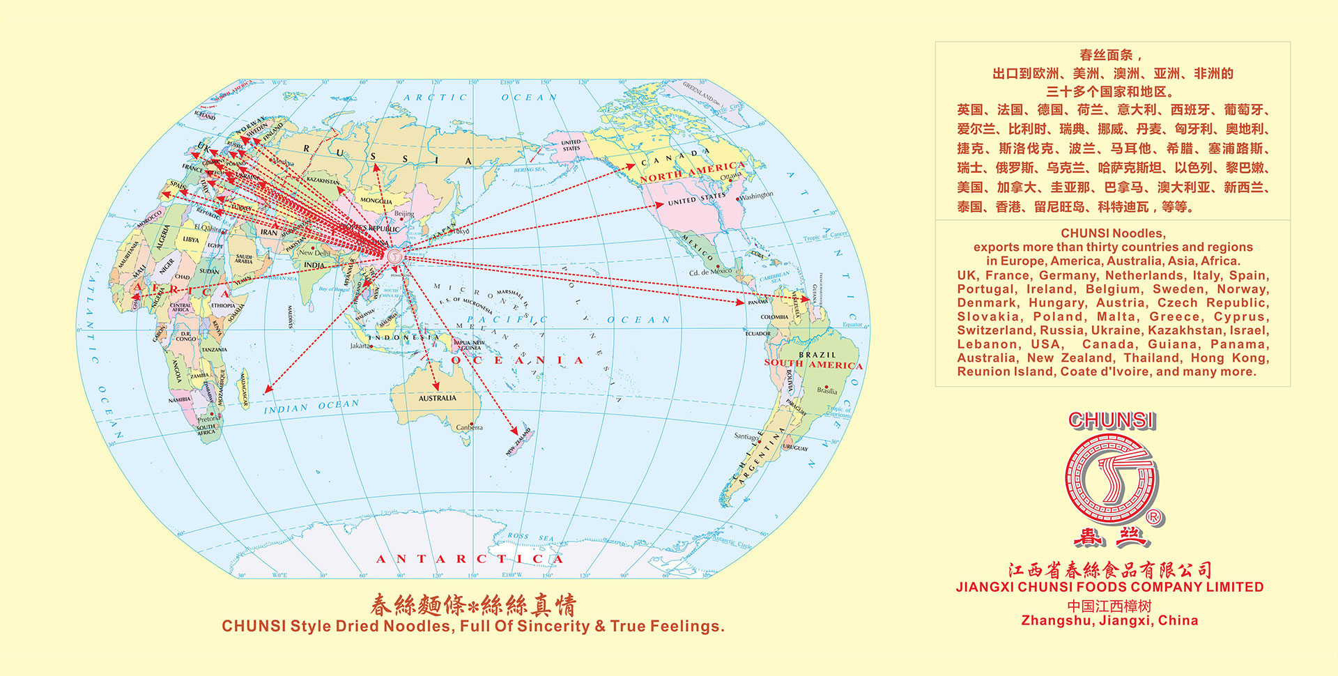 江西省春絲食品有限公司位于江西省樟樹市。 樟樹具有制作面條的悠久歷史傳統。古來即有民謠:“臨江府、清江縣(即樟樹),六歲伢仔會做面。” 今春絲公司是江西省內具有規模的面條、米粉加工企業,也是全國知名的面條生產企業。春絲公司現擁有“春絲”、“凌波仙子”、“絲絲福”、“春佳”四大品牌,一百多個品種。所有面條、米粉產品均選用合格原料,符合國家質量和衛生標準。產品具有安全健康、面體勁道、柔韌爽滑、易熟、久煮不糊、不渾湯等特色,深受廣大消費者歡迎。春絲產品已全面進入沃爾瑪、家樂福、樂購、歐尚、好又多、易初蓮花等大型超市,并遠銷美國、日本、英國、德國、法國、西班牙、意大利、葡萄牙、香港等二十多個國家和地區。